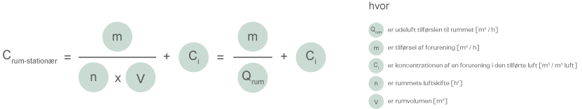 Derefter kan du ved hjælp af fortyndingsligningen beregne, hvor mange minutter pr. time og dag, vinduerne eller andre former for åbninger skal være åbne på kolde dage for at være under det ønskede CO2-niveau.