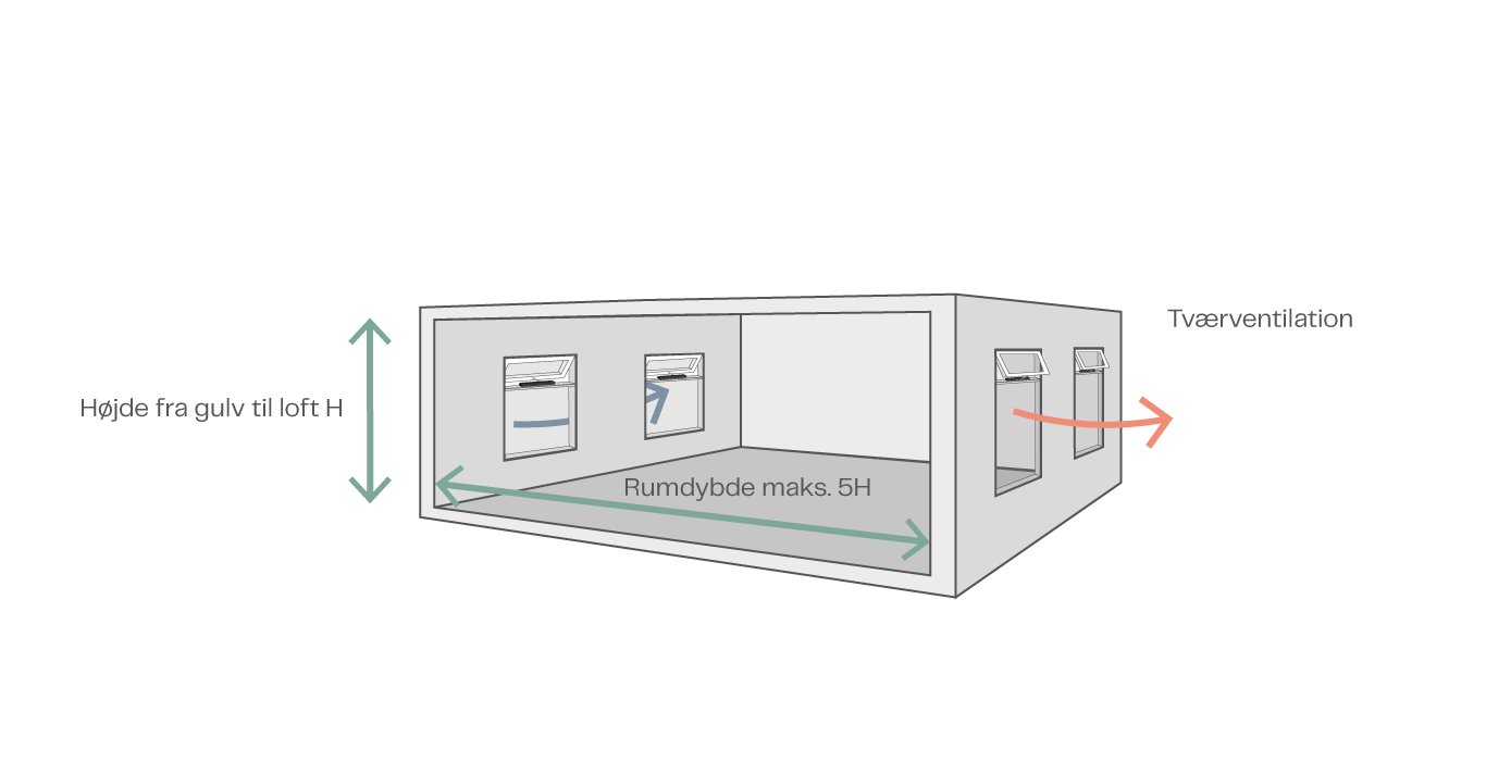 Hvis det område, der skal ventileres, er dybere end 2,5 x højden fra gulv til loft, kræves der normalt tværventilation eller opdriftsventilation for at opnå tilstrækkelig ventilation. Som en tommelfingerregel kan et område, hvor der bruges tvær- eller opdriftsventilation, ofte have en begrænset rumdybde på maks. 5 x højden fra gulv til loft.