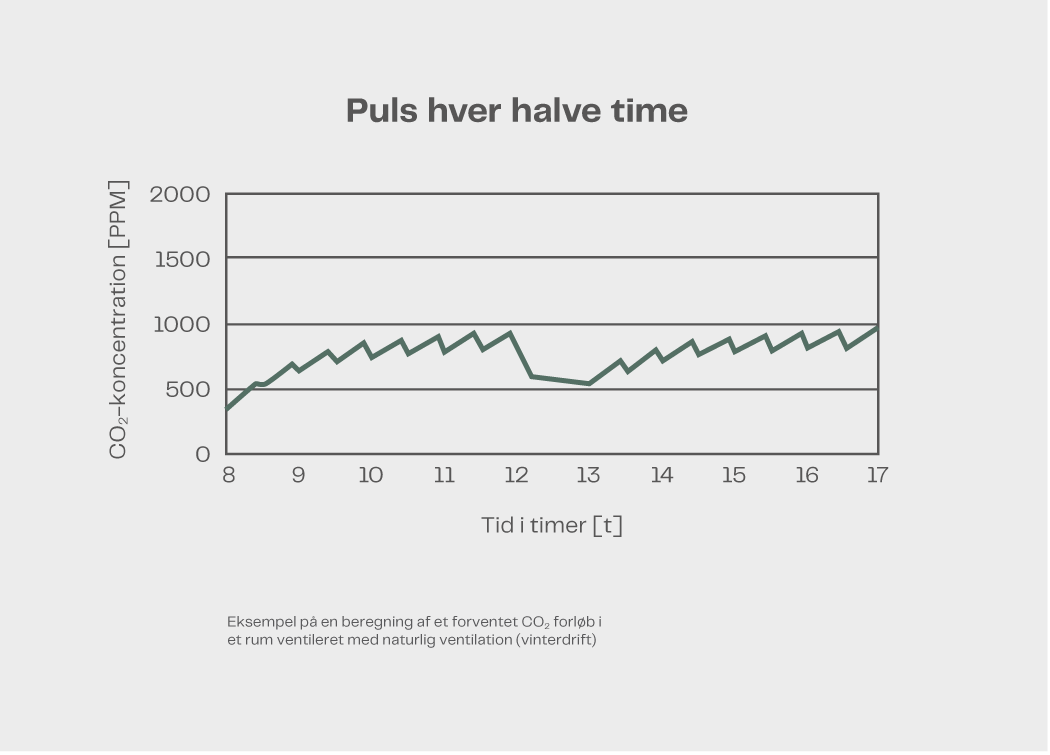 I Danmark har vi f.eks. brugt denne teknik i en travl kontorbygning, hvor der anvendes naturlig ventilation hele året rundt. Her har vi en illustration af den beregning, vi lavede i designfasen. Kravet om CO2-niveauet var maks. 1.000 ppm, og med den givne personbelastning var der brug for to åbninger (pulser) pr. time.