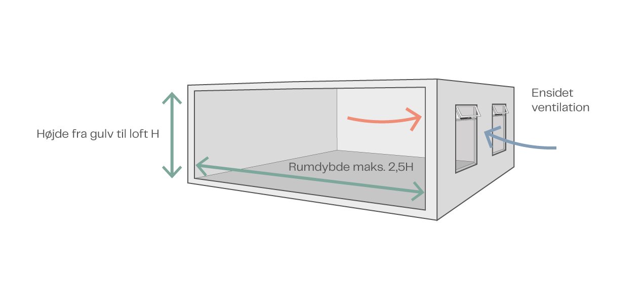 Hvis det område, der skal ventileres, har en maks. dybde på 2,5 x højden fra gulv til loft uden at overstige 10 m, så kan området ofte ventileres ved hjælp af ensidet ventilation.