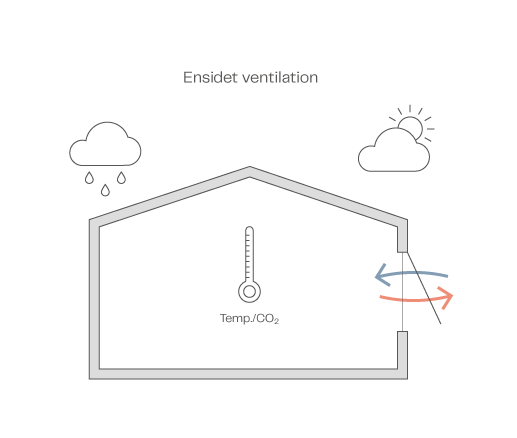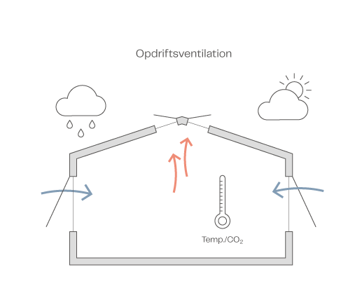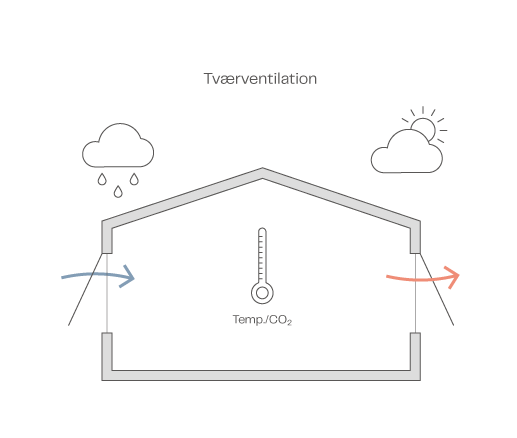 Generelt anbefaler vi derfor, at man dimensionerer de oplukkelige vinduer, så man opnår et meget alsidigt design. En af fordelene ved at bruge automatisk styrede vinduer er, at det er billigt at øge ventilationskapaciteten ud over det daglige standardbehov. Det kan være relevant i scenarier, hvor der er behov for ekstra ventilation.