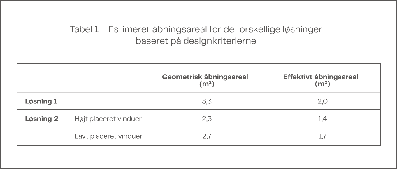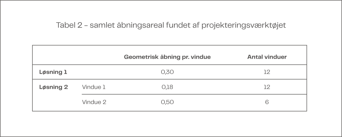 Tabel 2 viser antallet af vinduer, der kræves til løsning 1 og 2 for at opnå det åbningsareal, der blev fundet med projekteringsværktøjet i det foregående afsnit.