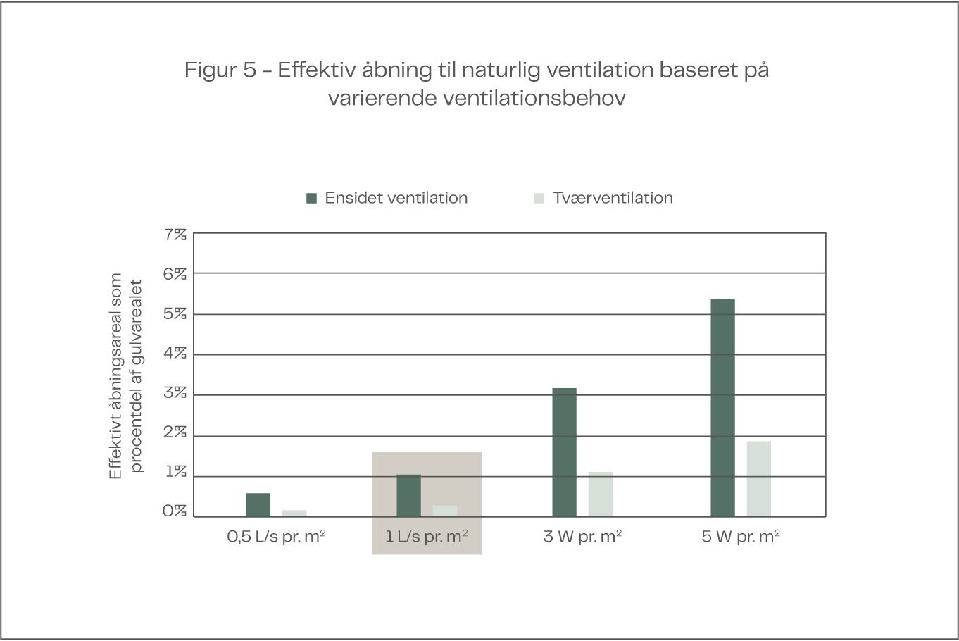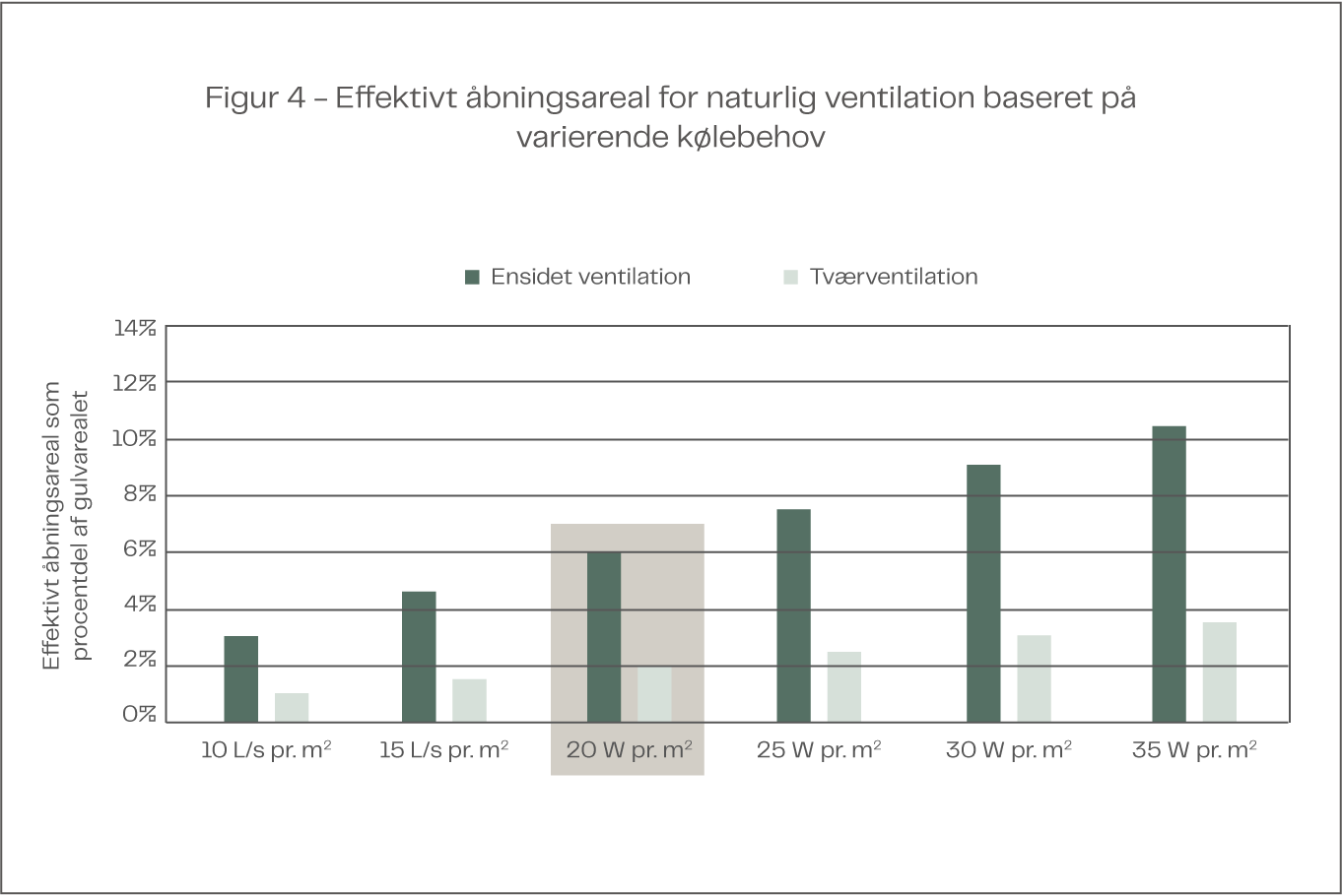 Figur 4 viser det effektive åbningsareal som en procentdel af det ventilerede gulvareal baseret på forskellige kølebehov. Baseret på udekriterierne, der er nævnt ovenfor, kan der opnås 20 W/m2 med et effektivt åbningsareal svarende til ca. 2% af gulvarealet med tværventilation. Hvis det kun er muligt med ensidet ventilation, er der behov for et betydeligt større åbningsareal (ca. 3 gange så meget). Hvis dette ikke er muligt, kan der foretages potentielle ændringer. Den ene er at øge vinduernes højde (se infoboksen nedenfor for en forklaring). En anden er at placere åbningerne i facaden på forskellige niveauer for at skabe en opdriftseffekt (svarende til løsning 2). Selvom det ikke er lige så effektivt som ovenlysvinduer, vil det stadig have en positiv effekt.