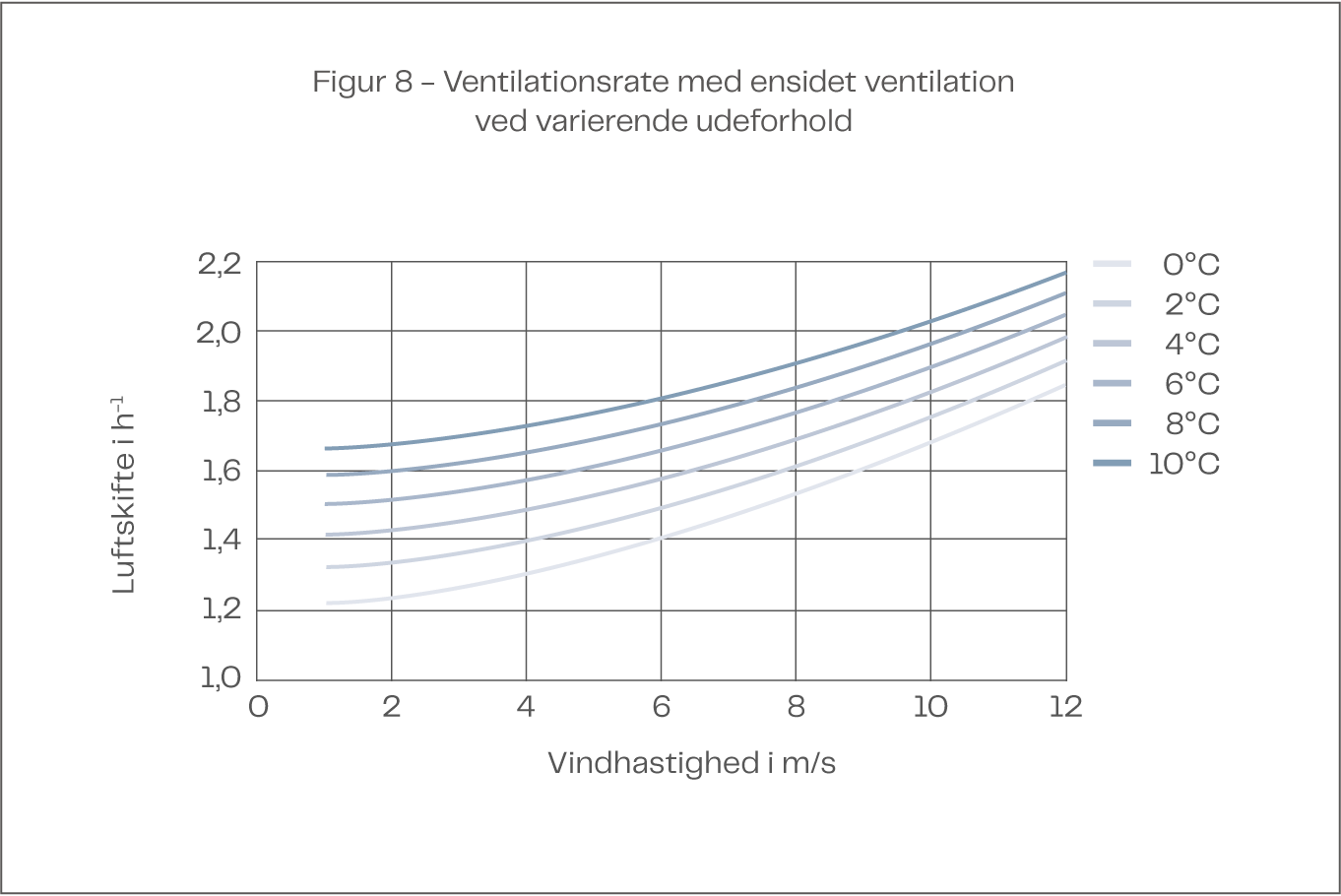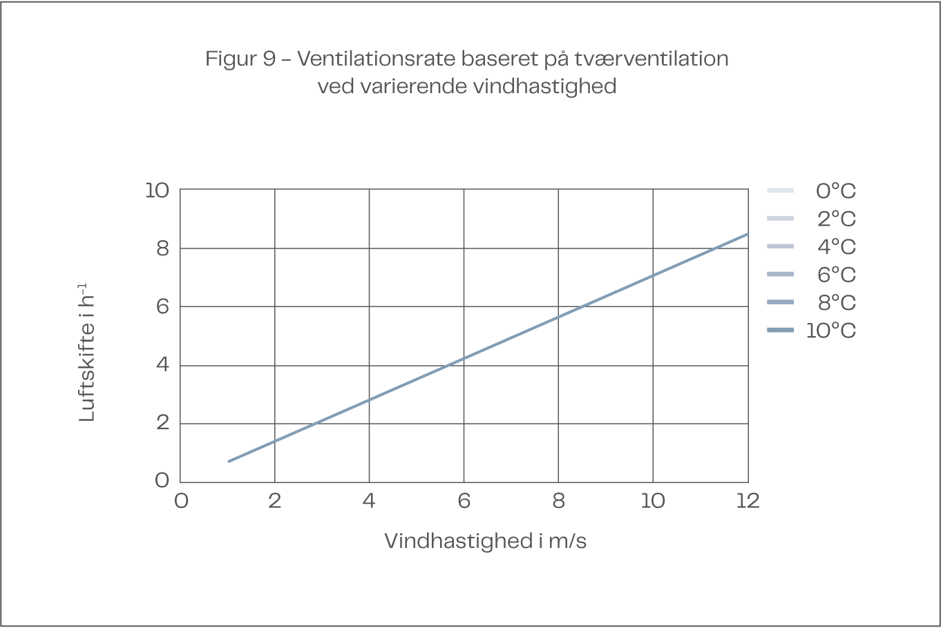 I praksis, når vindhastigheden er meget lav, kan ventilationsflowet effektivt fungere som ensidet ventilation, især når udetemperaturen er lav. Figur 9 viser luftskiftet i rummet med ensidet ventilation. Hvis man sammenligner ydelsen med tværventilation i figur 9, vil luftskiftet være højere med ensidet ventilation, når temperaturforskellen er ca. 10 °C, og vindhastigheden er under 2 m/s.