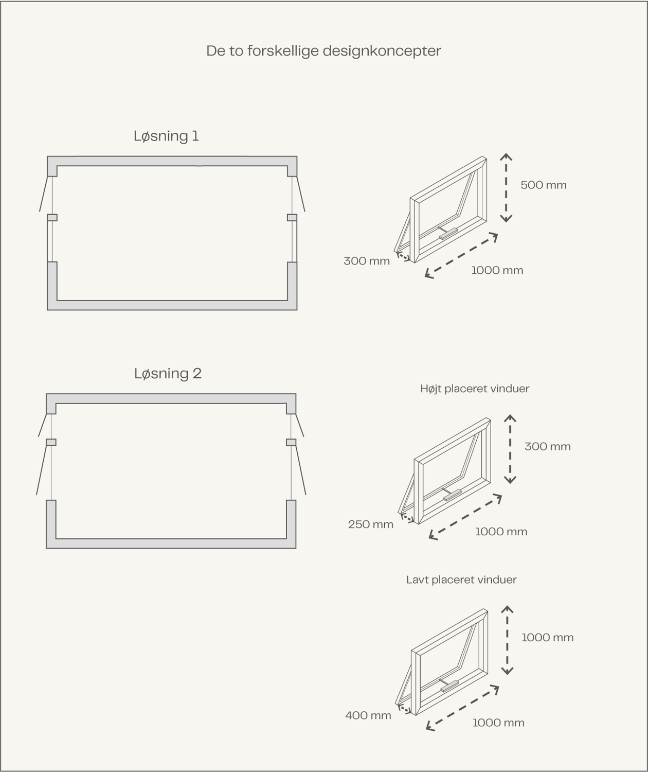 - Løsning 2: De mindre højt placeret vinduer er designet til at opnå en acceptable luftkvalitet med 1 L/s/m2. De større lavt placeret vinduer er designet til at opnå et kølepotentiale på 20 W/m2 i kombination med de mindre vinduer.