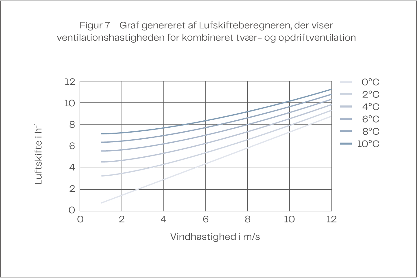 Figur 7 viser en graf genereret af Lufskifteberegneren for kombineret opdrift- og tværventilation. Du kan hurtigt analysere, hvordan luftskiftet påvirkes, når vindhastigheden og temperaturforskellen øges.