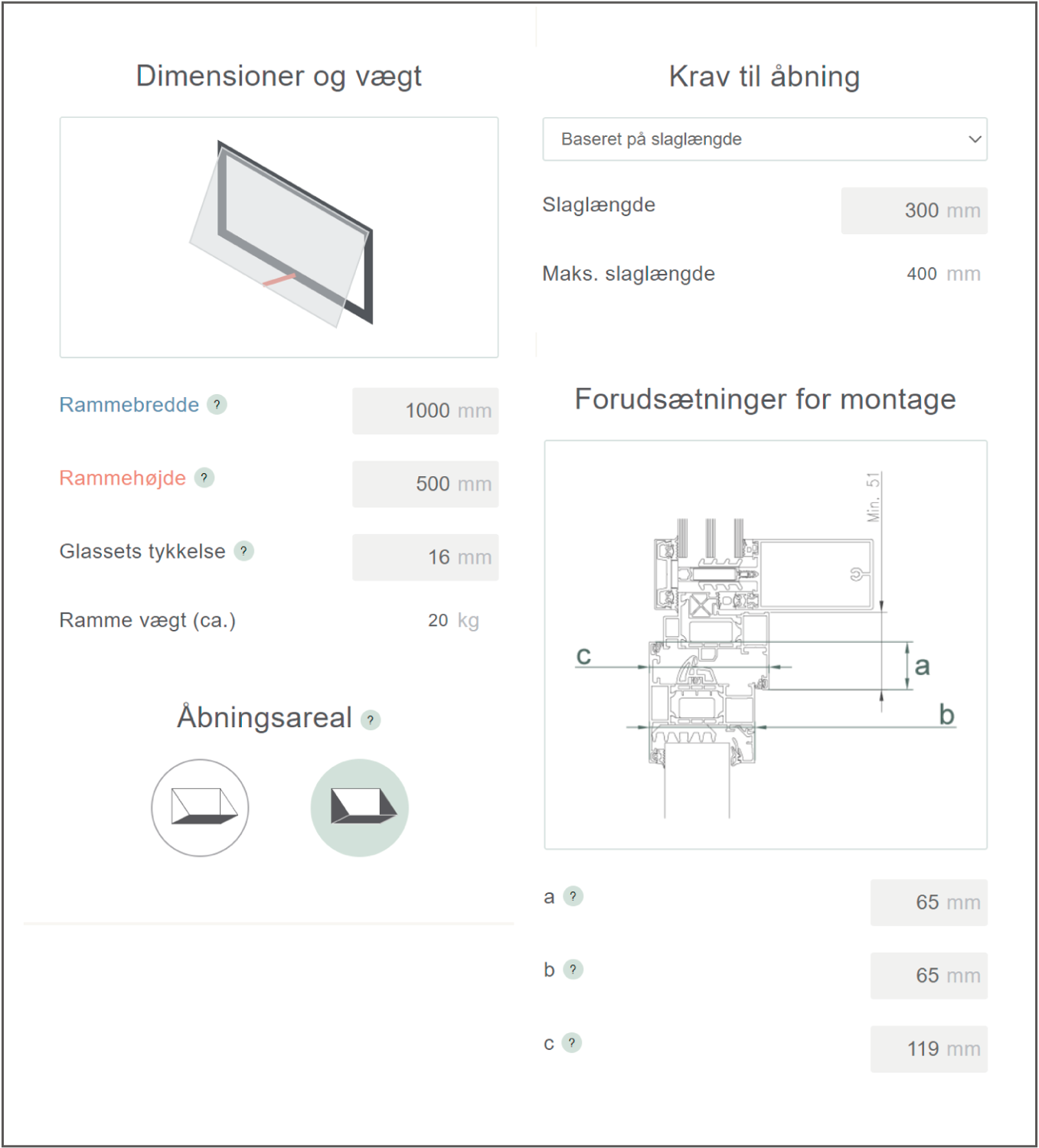 Actuator Finder kan bruges til at finde det præcise geometriske åbningsareal for et automatisk styret vindue baseret på vinduets og rammens dimensioner. En af de mest almindelige faldgruber, når man beregner åbningsarealet for et automatisk styret vindue, er, at man ikke tager korrekt højde for forhindringer i rammen. I Actuator Finder kan du angive detaljerede oplysninger om vinduesprofilerne og meget nøjagtigt beregne åbningsarealet for hver vindueskonfiguration.