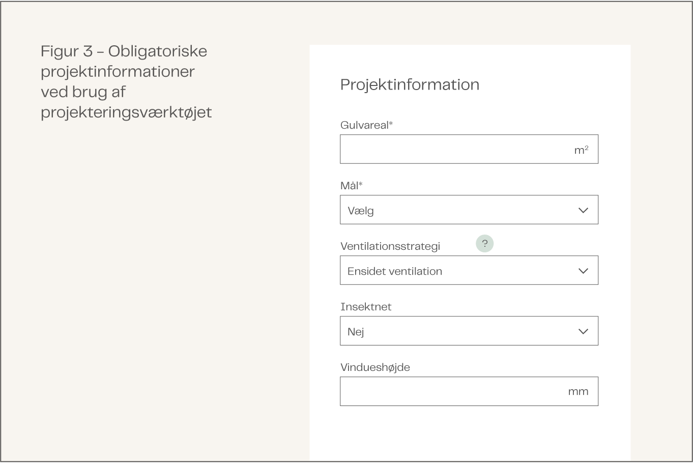 Projekteringsværktøjet kan bruges til at finde det samlede åbningsareal til ventilation og/eller køling i en zone eller et rum. Dette vil afhænge af ventilationsraten, designet og ventilationsprincippet. Det er vigtigt for succesen af et naturligt ventilationssystem at vælge passende kriterier, når du dimensionerer det maksimale åbningsareal for dit design. Hvis designets maksimale kapacitet kun er baseret på ventilationskravet for frisk luft, kan du ende med et utilstrækkeligt åbningsareal til f.eks. termisk komfort.