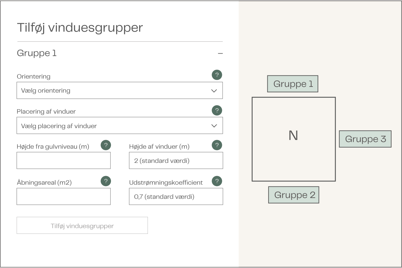 For at bruge dette værktøj skal du tilføje en eller flere vinduesgruppe(r) til en zone. Hver gruppe vil bestå af alle de automatisk styrede vinduer de sidder i samme facade og højde. Åbningsarealet svarer derfor til det samlede åbningsareal for disse vinduer.