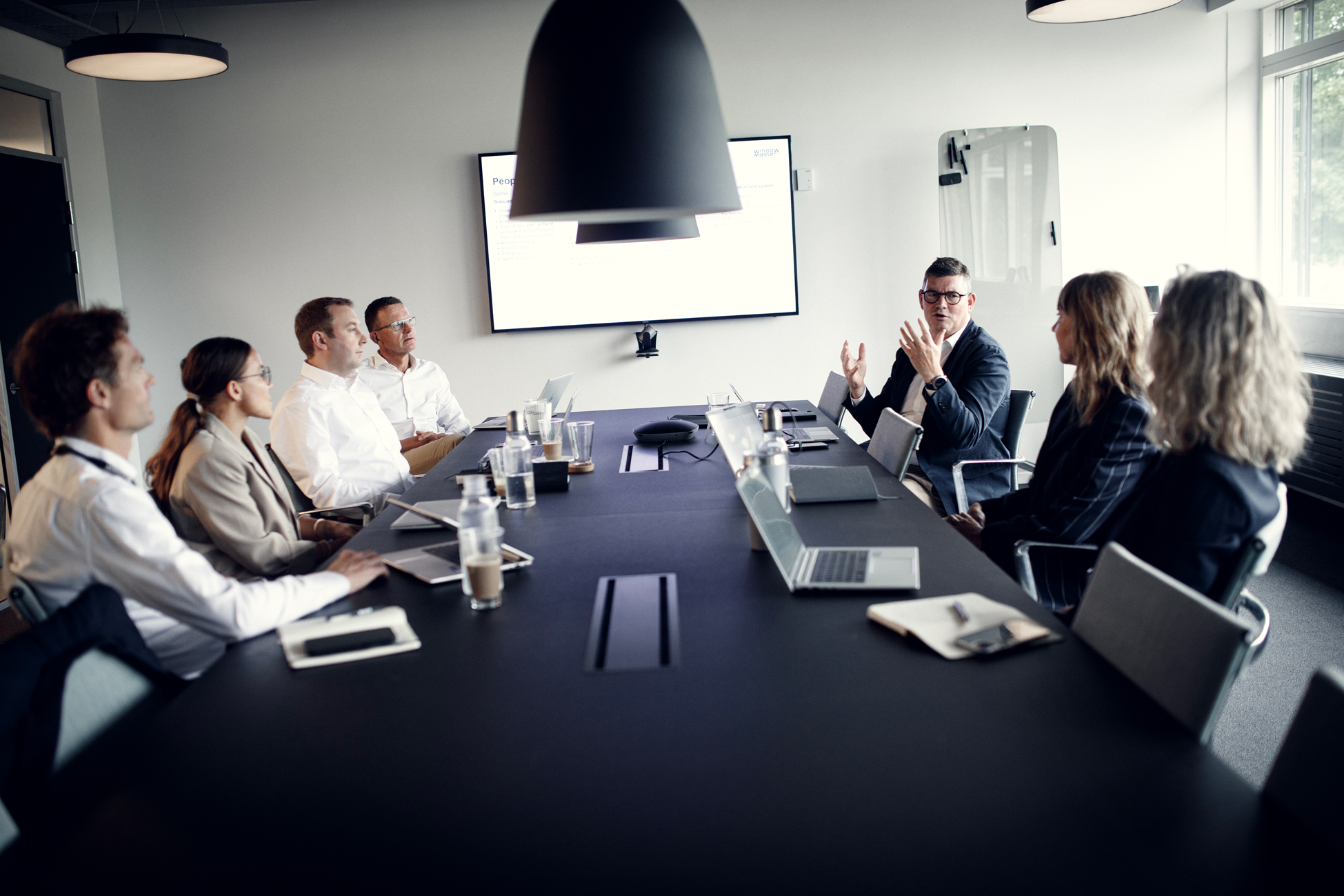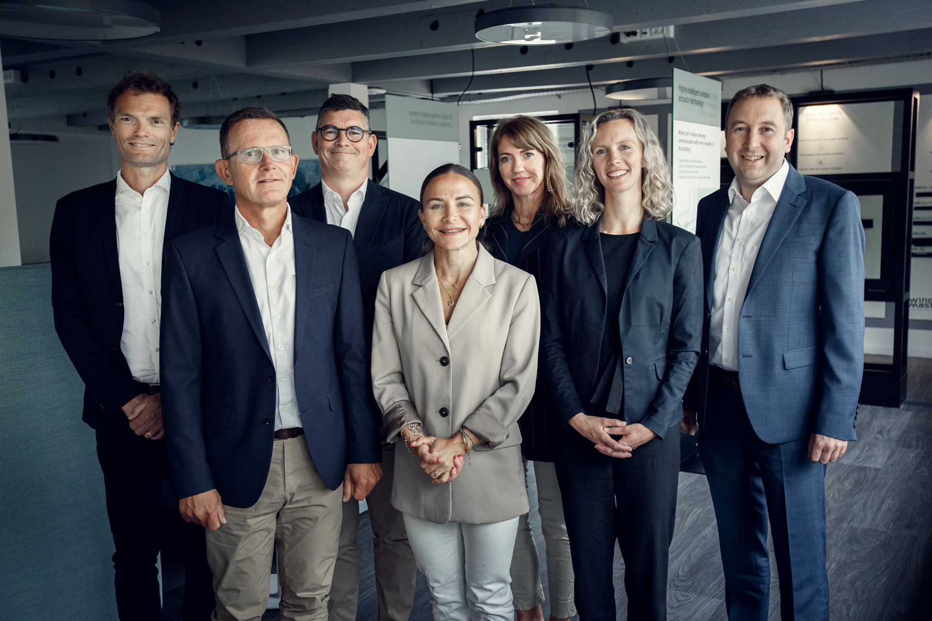WindowMasters ledelse (fra venstre): Chief Product Officer Nicolaj Rasmussen Shabtai, CFO Steen Overgaard Sørensen, CEO Erik Boyter, Chief Sustainabillity Officer Irina Torres, Chief People & Culture Officer Christa Dahl-Jensen Plambek, Chief Business Development Officer Mia Brøndum og Chief Operations Officer Markus Weidmann