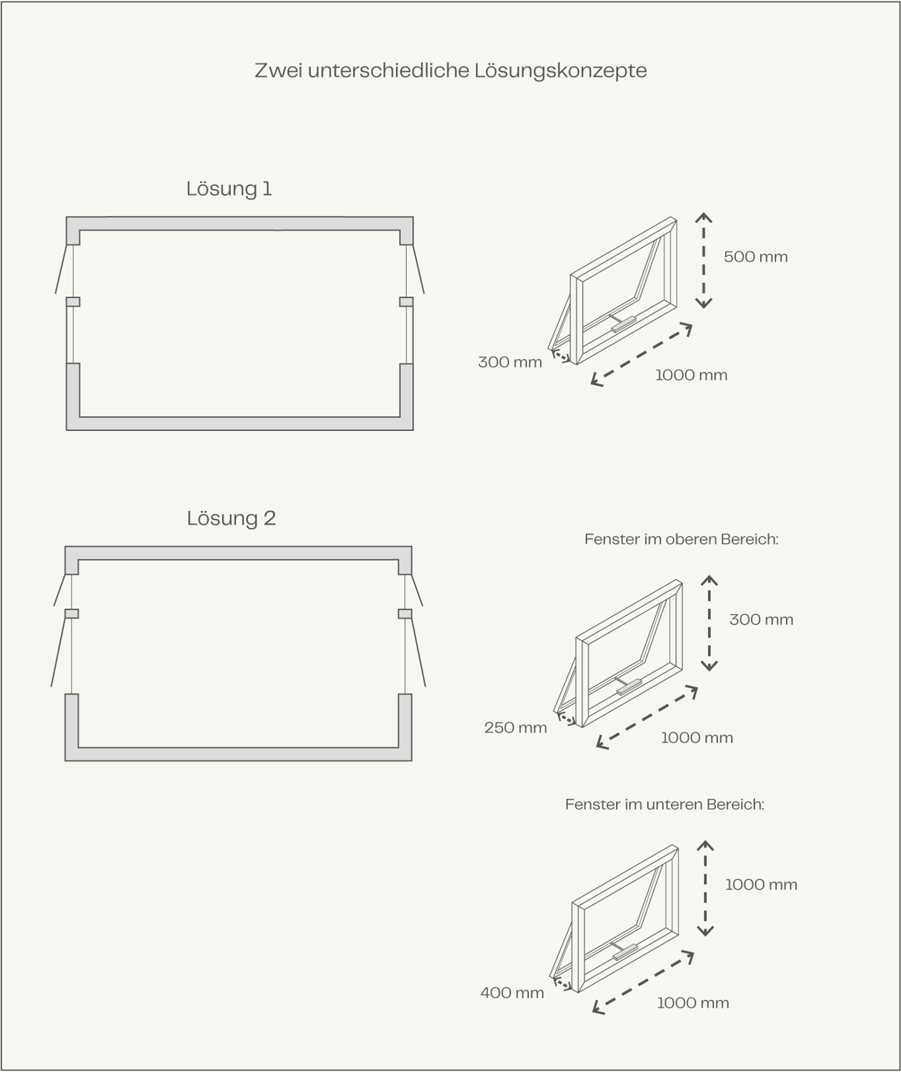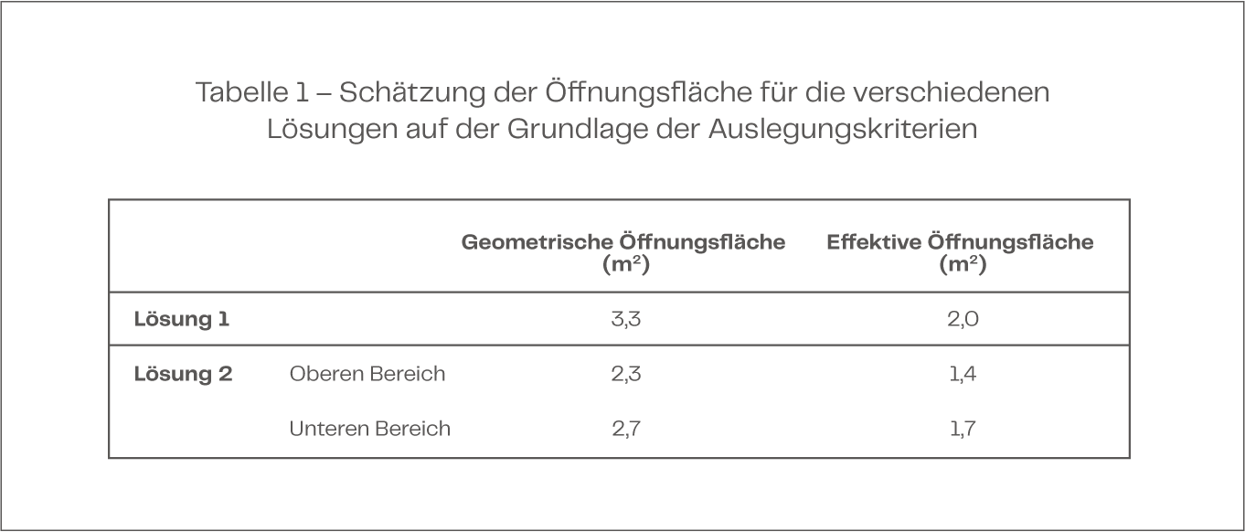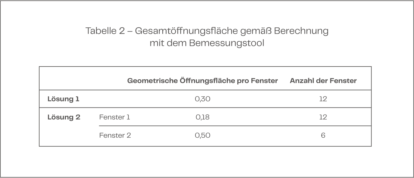 Aus Tabelle 2 geht die Anzahl der erforderlichen Fenster hervor, um bei Lösung 1 und 2 jeweils die mit dem Bemessungstool ermittelte Öffnungsfläche (siehe vorausgehende Abschnitte) zu erreichen.