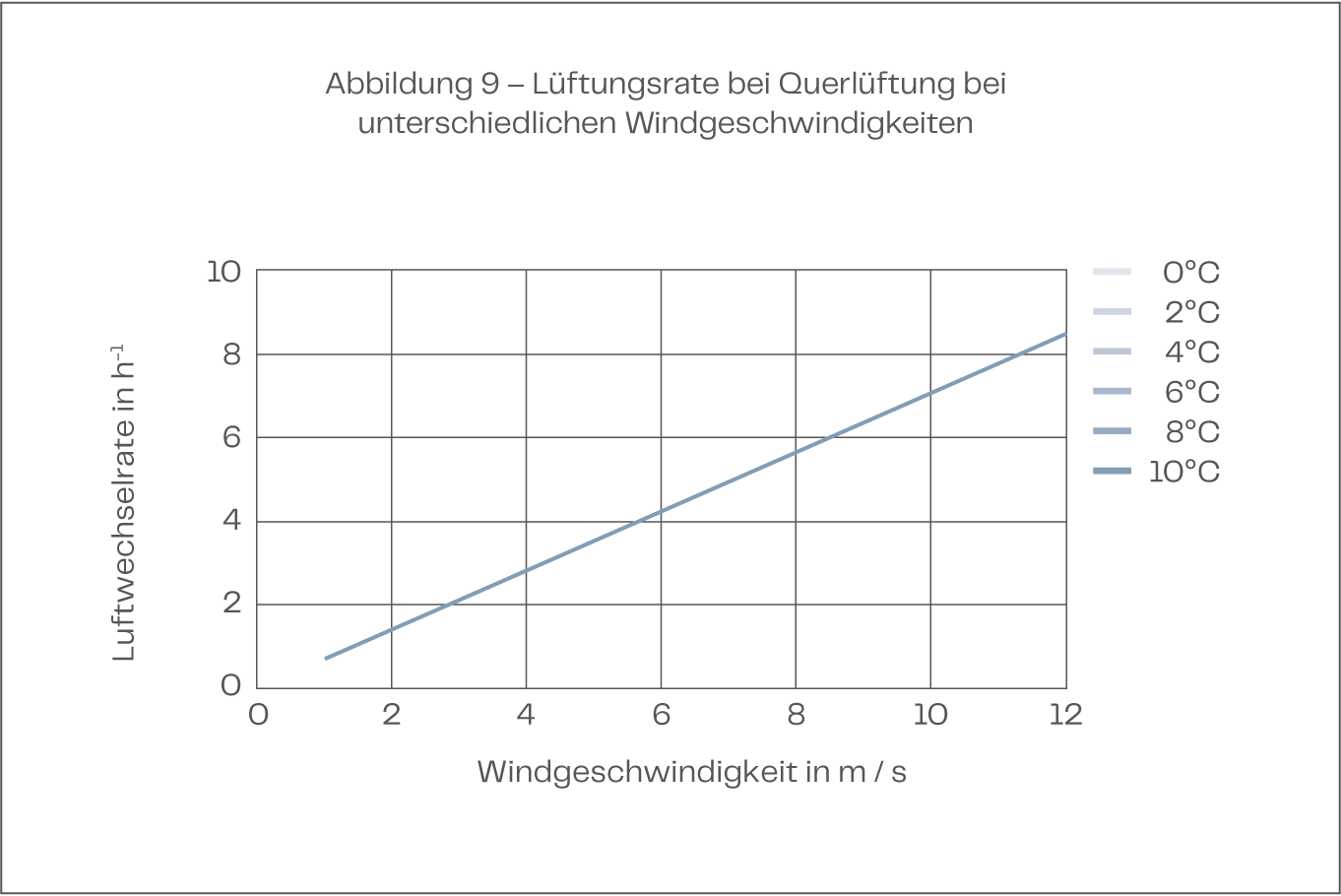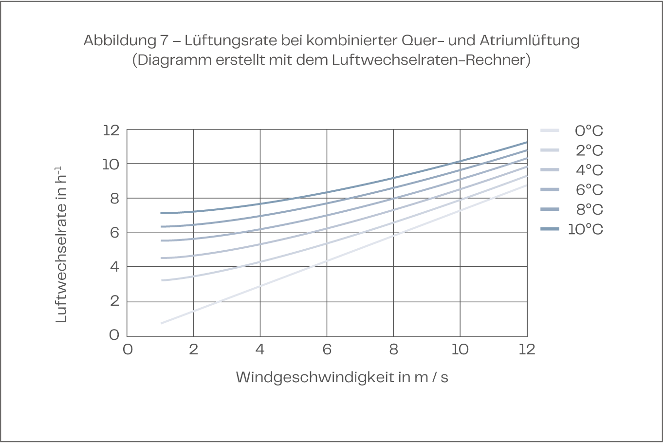 In Abbildung 7 ist ein mit dem Luftwechselraten-Rechner erstelltes Diagramm der Luftwechselrate bei kombinierter Auftriebs- und Querlüftung dargestellt. In diesem Diagramm lässt sich auf einen Blick erkennen, wie sich die Lüftungsrate bei steigender Windgeschwindigkeit oder Temperaturdifferenz verändert.