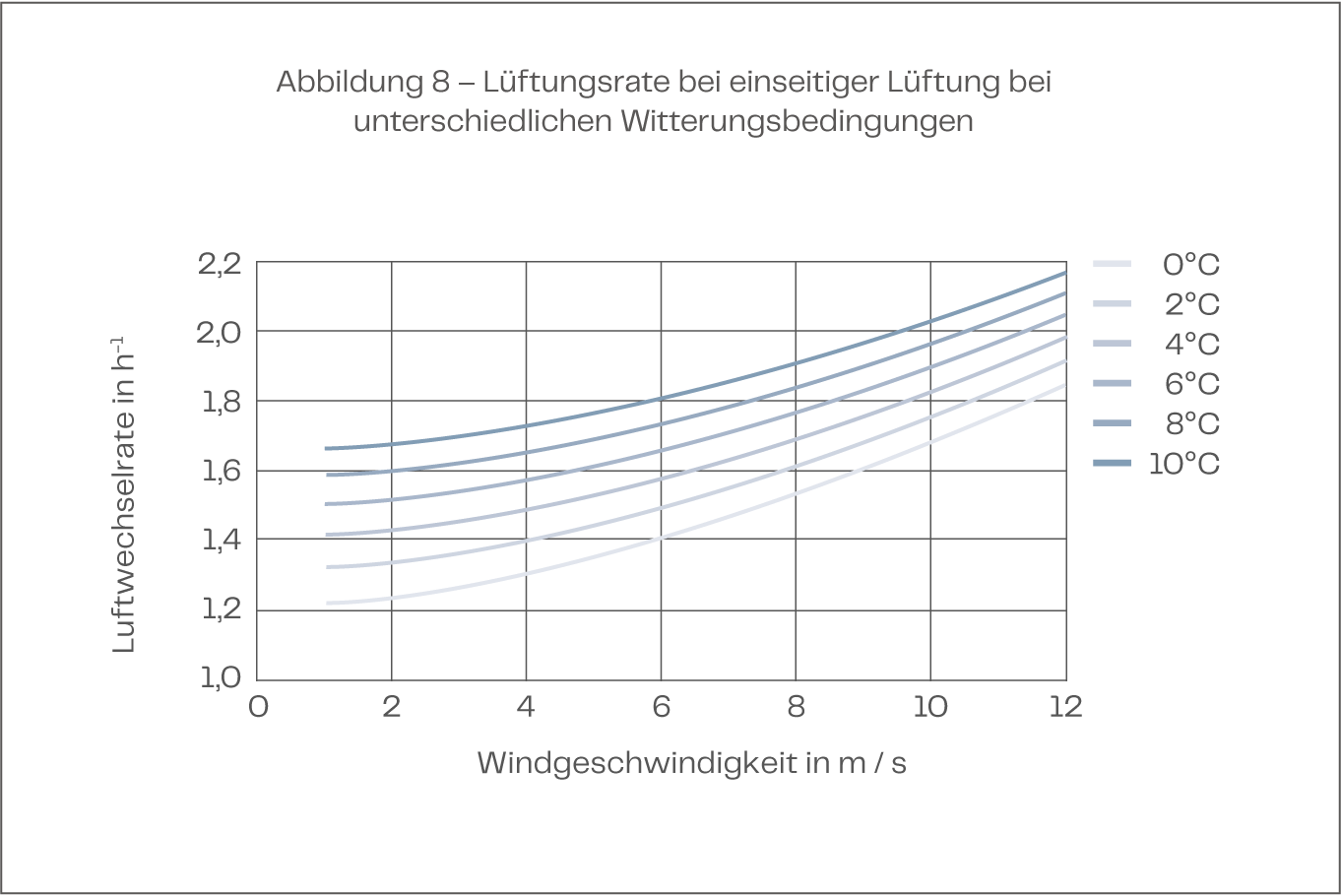 Für Lösung 1 im hier erläuterten Anwendungsbeispiel können wir prüfen, wie die endgültige Auslegung bei verschiedenen Witterungsbedingungen und bei Nutzung unterschiedlicher Lüftungsprinzipien funktioniert. Abbildung 8 zeigt die Lüftungsleistung der Lösung 1 bei einseitiger Lüftung des Raums abhängig lediglich vom Winddruck.