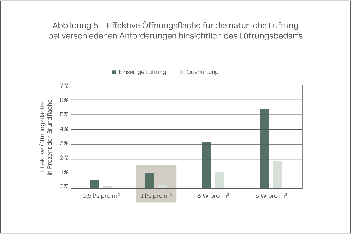 Abbildung 5 zeigt die effektive Öffnungsfläche als Prozentsatz der Bodenfläche auf der Grundlage verschiedener Lüftungsanforderungen. Die kleinen Fenster können auf der Grundlage von 1 L/s/m2 dimensioniert werden, um eine CO2-Konzentration von unter 1000 ppm bei Vollbelegung zu erreichen. Aufgrund des unvorhersehbaren Fensterbetriebs während des Lüftungsbetriebs kann nicht immer sichergestellt werden, dass die Fenster an beiden Fassaden gleichzeitig geöffnet sind, und es kann vorteilhaft sein, die kleinen Fenster auf der Grundlage einer einseitigen Lüftung auszulegen. In diesem Fall müssen die kleinen Fenster daher eine effektive Öffnungsfläche haben, die etwa 1 % der Bodenfläche entspricht.