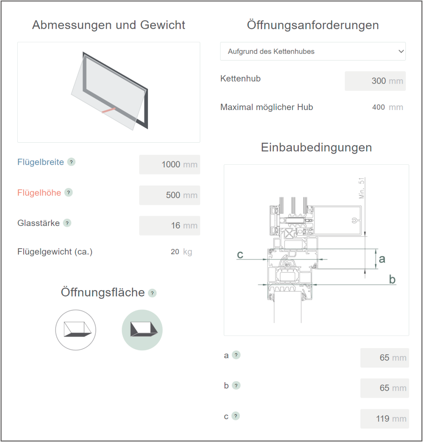 Mit dem AntriebsFinder können Sie ausgehend von den Fenster- und Rahmenabmessungen präzise die geometrische Öffnungsfläche eines steuerbaren Fensters ermitteln. Einer der häufigsten Fehler bei der Berechnung der Öffnungsfläche eines steuerbaren Fensters besteht darin, die Hindernisse am Fensterrahmen und dergleichen nicht korrekt zu berücksichtigen. Bei Nutzung des AntriebsFinders können Sie detaillierte Daten zu den Fensterprofilen spezifizieren und die Öffnungsfläche jedes Fenstertyps sehr präzise berechnen.