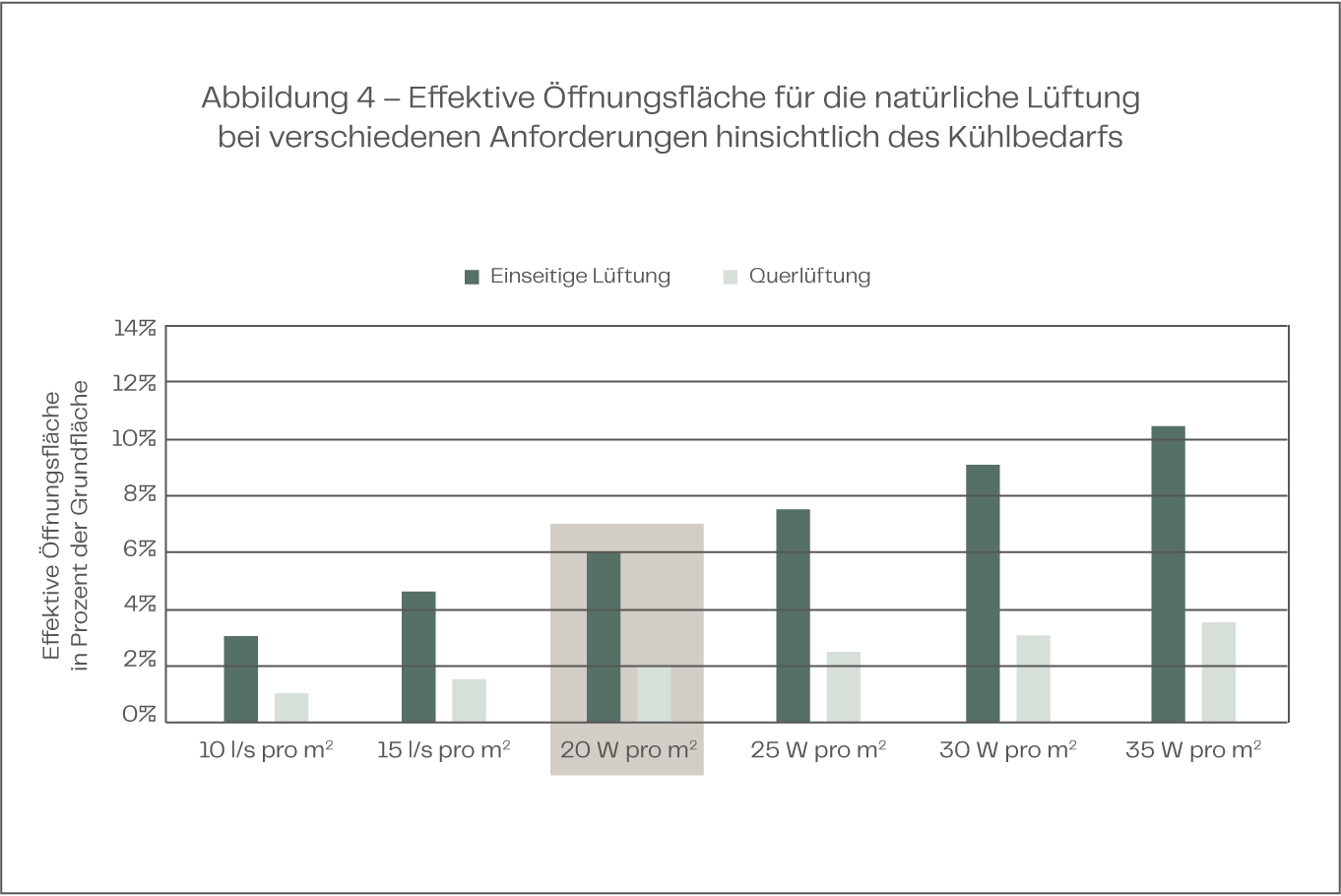 Des Weiteren gilt es zu berücksichtigen, dass das Kühlpotenzial einer natürlichen Lüftung in den Sommermonaten aufgrund der hohen Außentemperaturen begrenzt ist, sodass die Erwartungen bei der Spezifikation des Kühlbedarfs entsprechend angepasst werden müssen.