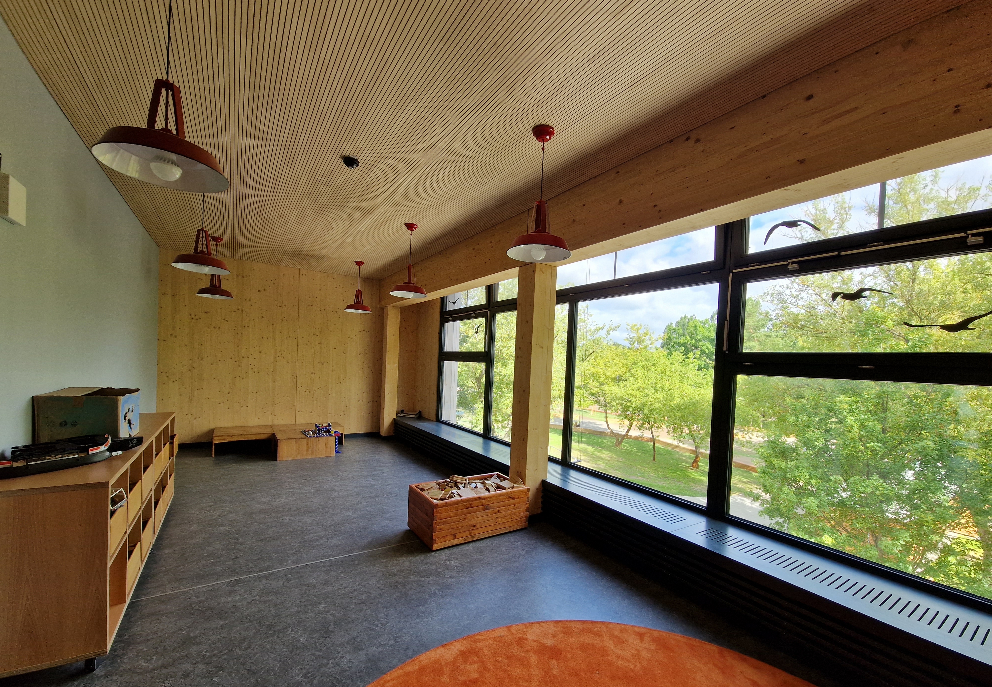 Die nachhaltige Gestaltung des Gebäudes spiegelt sich nicht nur in der Massivholzbauweise, sondern auch in der Wahl des Lüftungskonzeptes wider. So kommt in allen Bereichen ein natürliches Lüftungssystem zum Einsatz. Dieses Konzept basiert auf intelligent gesteuerten Fensteröffnungen. Sie sorgen aufgrund ihrer vollumfänglichen Automatisierung rund um die Uhr für eine zuverlässige Raumlüftung und Frischluftzufuhr. Die Wahl fiel hier auf eine Mischung der Lüftungsprinzipien „einseitige Lüftung“ und „Querlüftung“. Die einseitige Lüftung kommt dabei in Räumen zum Einsatz, die nur auf einer Seite über Fenster verfügen. Die Querlüftung hingegen wird mithilfe von Fenstern auf zwei gegenüberliegenden Seiten des Raumes erreicht. So entsteht ein quer durch den Raum verlaufender Luftstrom, der optimal und mit so wenig Zugluft wie möglich eingestellt wird. Die meisten Räume des Hortes verfügen zudem zusätzlich über manuell zu betätigende Fenster. So können die Gebäudenutzer das Raumklima bei Bedarf spontan auch eigenständig regeln.