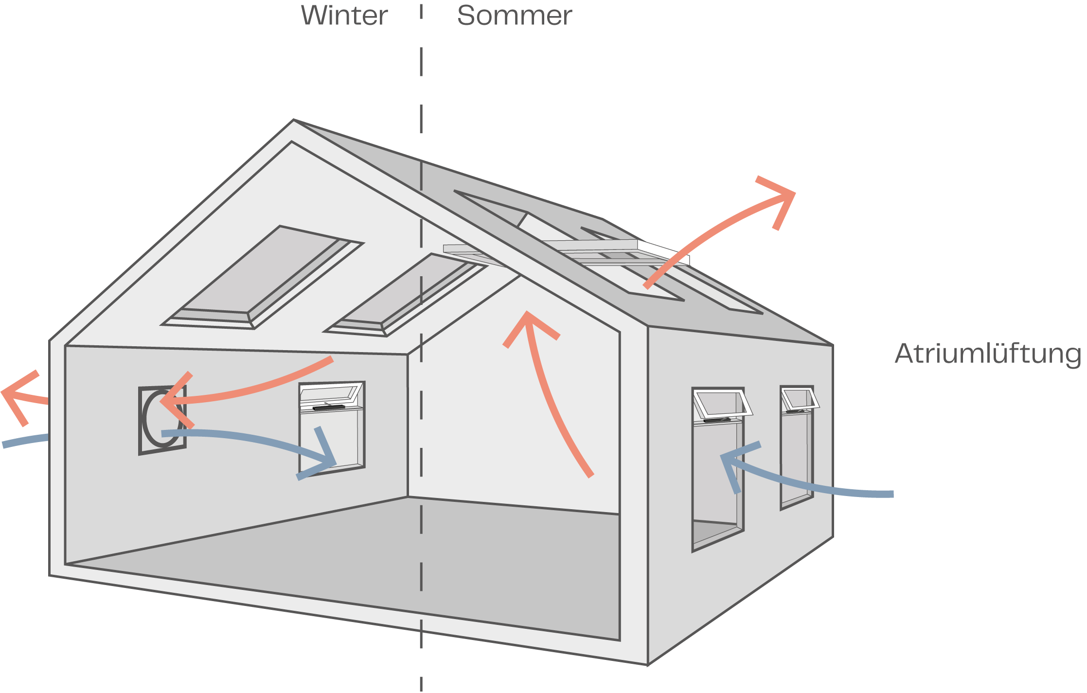 In der öffentlichen Diskussion in Deutschland findet die kontrollierte natürliche Fensterlüftung (KNL) und eine Kombination dieser mit mechanischen Lüftungslösungen – gerade im Vergleich zu vielen nordeuropäischen Ländern – kaum Beachtung. Obwohl sie erhebliche Vorteile birgt. Bei der KNL entstehen die notwendigen Luftströme allein durch Temperatur- und Druckunterschiede zwischen Innen- und Außenluft sowie durch den natürlichen Wind. Das Öffnen und Schließen der Fenster wird dabei durch intelligente Sensoren – zum Beispiel zur Überprüfung von Temperatur, Niederschlag und CO2-Gehalt – sowie mechanische Antriebe vollautomatisiert gesteuert. Dies geschieht äußerst leise und zuverlässig. Ein Vergessen der Fensterlüftung ist gänzlich ausgeschlossen. Auf Wunsch kann das System auch vollständig in die Gebäudeleittechnik integriert werden. Zur Klimatisierung verwendet es den Effekt der natürlichen Nachtauskühlung. Dabei wird warme, abgestandene Luft nachts durch die automatisiert gesteuerten Fensteröffnungen nach außen abgeführt. Kalte Luft strömt nach und kühlt Wände und Gegenstände ab, so dass diese tagsüber erneut Wärme aufnehmen können – ein natürlicher Kühlvorgang, der keine externe Energie benötigt.