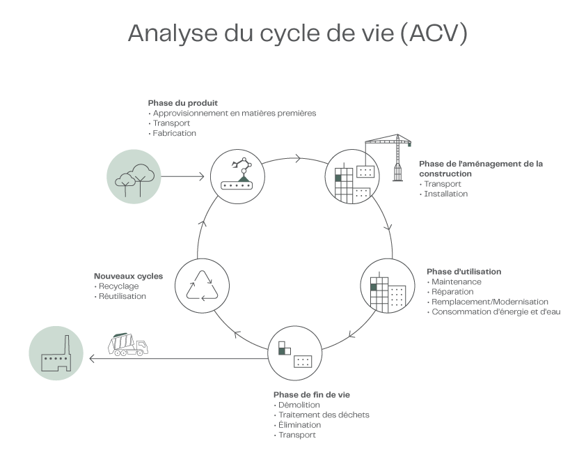 La FDES repose sur une analyse du cycle de vie (ACV). Le cycle de vie d’un produit englobe tous les processus, depuis l’extraction des matières premières jusqu’à l’installation, l’utilisation et l’élimination / recyclage, en passant par la fabrication et la transformation.