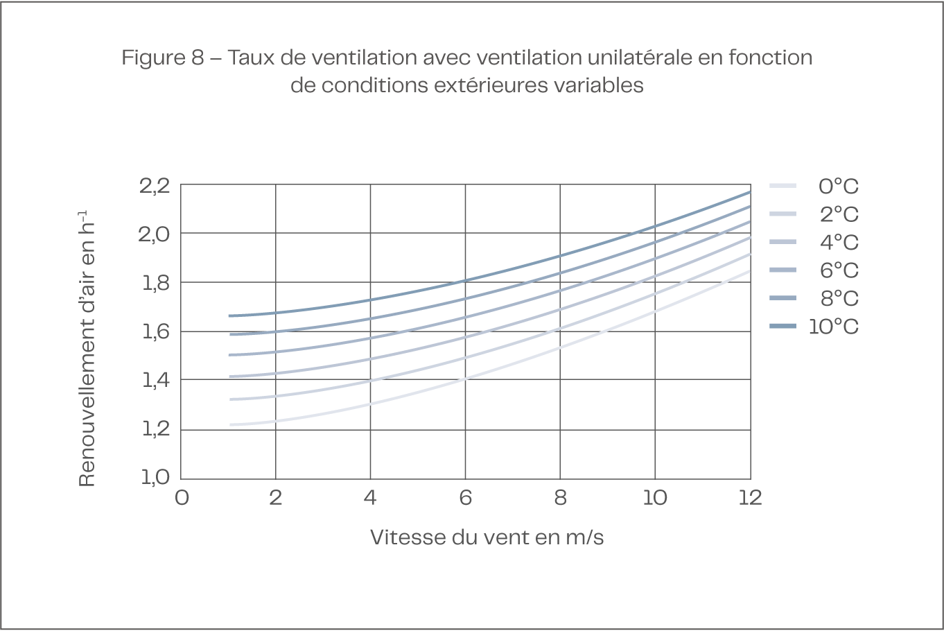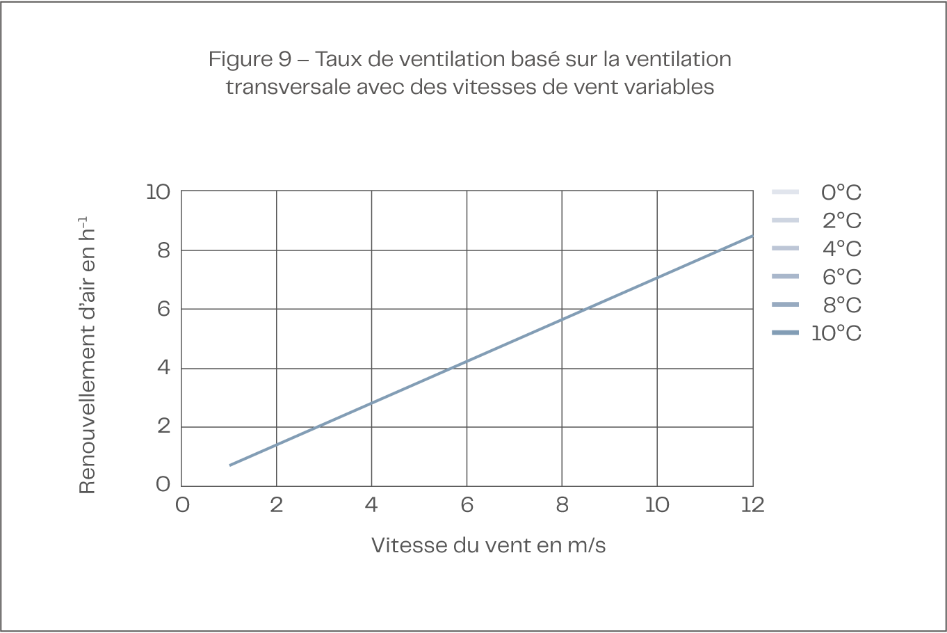 Dans la pratique, lorsque la vitesse du vent est très faible, le flux de ventilation peut effectivement fonctionner comme une ventilation unilatérale, en particulier lorsque la température extérieure est basse. La figure 9 montre le taux de renouvellement de l’air dans la pièce avec une ventilation unilatérale. Si l’on compare les performances de la ventilation transversale à celles de la figure 9, le taux de renouvellement de l’air est plus élevé avec la ventilation unilatérale lorsque la différence de température est approximativement supérieure à 10 °C et que la vitesse du vent est inférieure à 2 m/s.