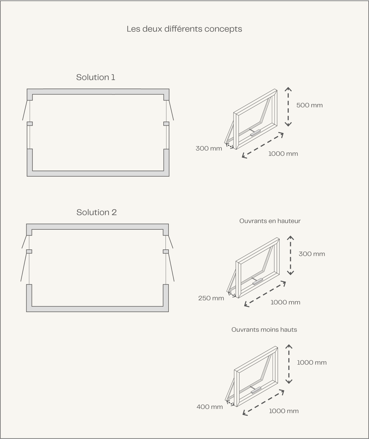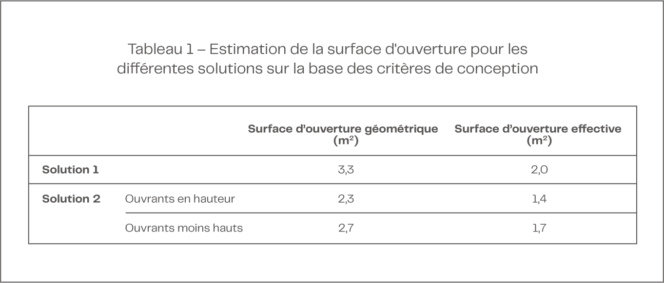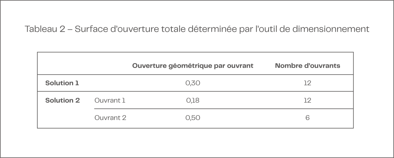 Le tableau 2 indique le nombre d’ouvrants nécessaires pour les solutions 1 et 2 afin d’obtenir la surface d’ouverture déterminée par l’outil de dimensionnement dans la section précédente.