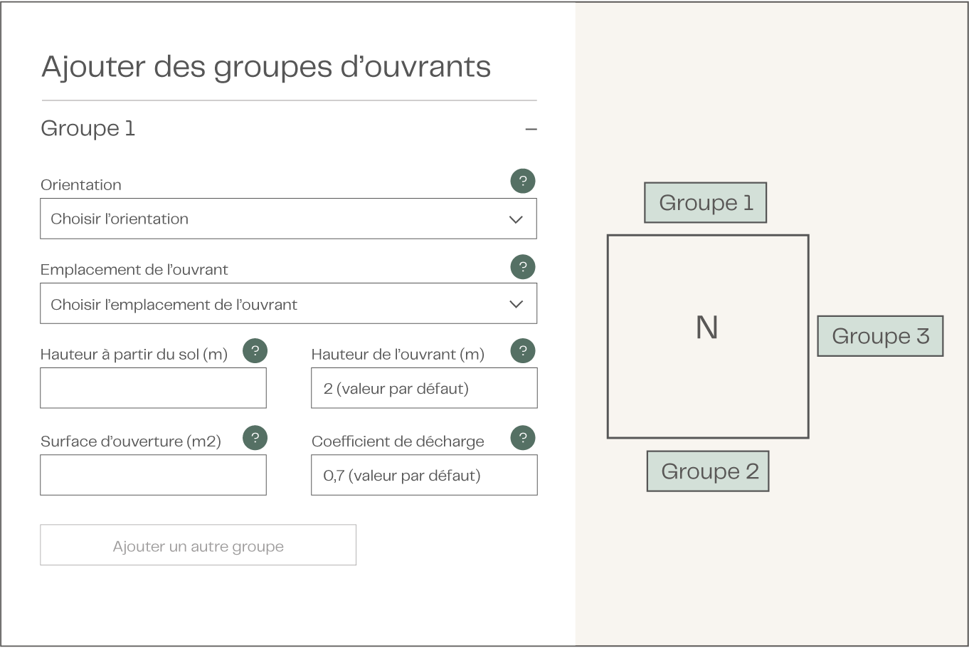Pour utiliser cet outil, vous devez ajouter un ou plusieurs groupes d’ouvrants à une zone. Chaque groupe sera composé de tous les ouvrants situées sur la même façade et à la même hauteur. La surface d’ouverture correspond par conséquent à la surface d’ouverture totale de ces ouvrants.