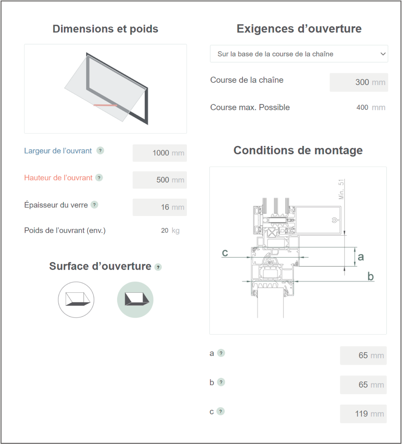 Le ActuatorFinder peut être utilisé pour déterminer avec précision la surface d’ouverture géométrique d’un ouvrant sur la base des dimensions de la partie ouvrante et du cadre. L’un des pièges les plus courants lors du calcul de la surface d’ouverture d’un ouvrant consiste à ne pas prendre correctement en compte les obstructions du cadre, etc. Dans l’ActuatorFinder, vous pouvez spécifier des informations détaillées sur les profils des ouvrants et calculer très précisément la surface d’ouverture de chaque configuration d’ouvrant.