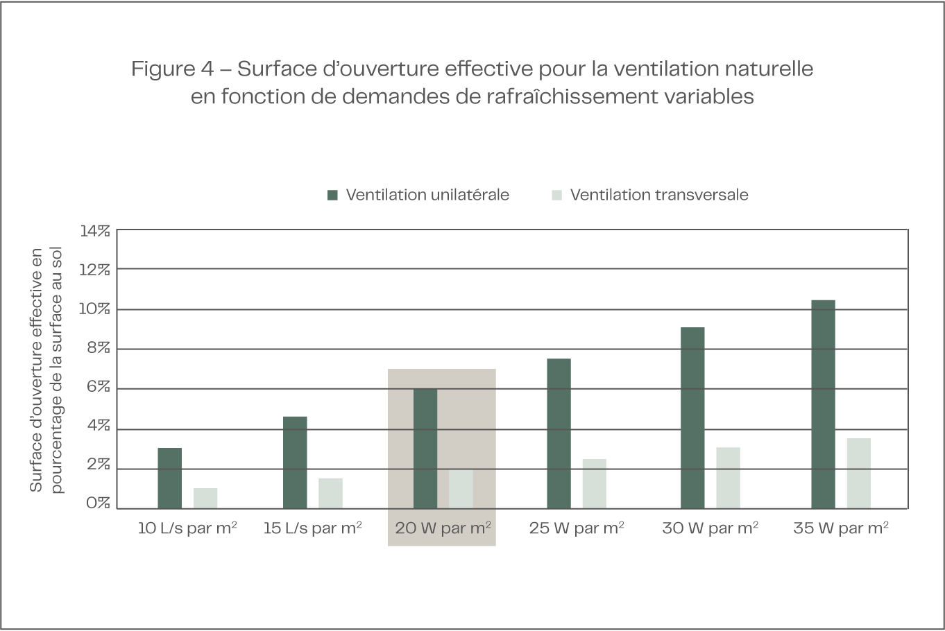 Les grandes ouvertures seront conçues pour obtenir l'effet de refroidissement souhaité (20 W/m2) en combinaison avec les petites ouvertures. Lorsque le refroidissement est nécessaire, il est beaucoup plus prévisible que toutes les fenêtres soient ouvertes car il s'agit généralement d'une belle journée d'été et il est raisonnable de concevoir l'ouverture globale requise en se basant sur la ventilation transversale. Pour obtenir un effet de refroidissement conformément à la figure 4, les petites ouvertures représenteront 0,5 % de la surface au sol et la surface d'ouverture effective de la plus grande ouverture représentera le reste de la surface d'ouverture effective, soit environ 1,5 % de la surface au sol.