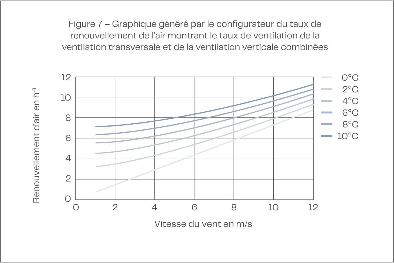 La figure 7 montre un graphique généré par le configurateur du taux de renouvellement de l’air pour une ventilation verticale et une ventilation transversale combinées. Très rapidement, vous pouvez analyser comment le taux de ventilation sera affecté lorsque la vitesse du vent et la différence de température augmentent.