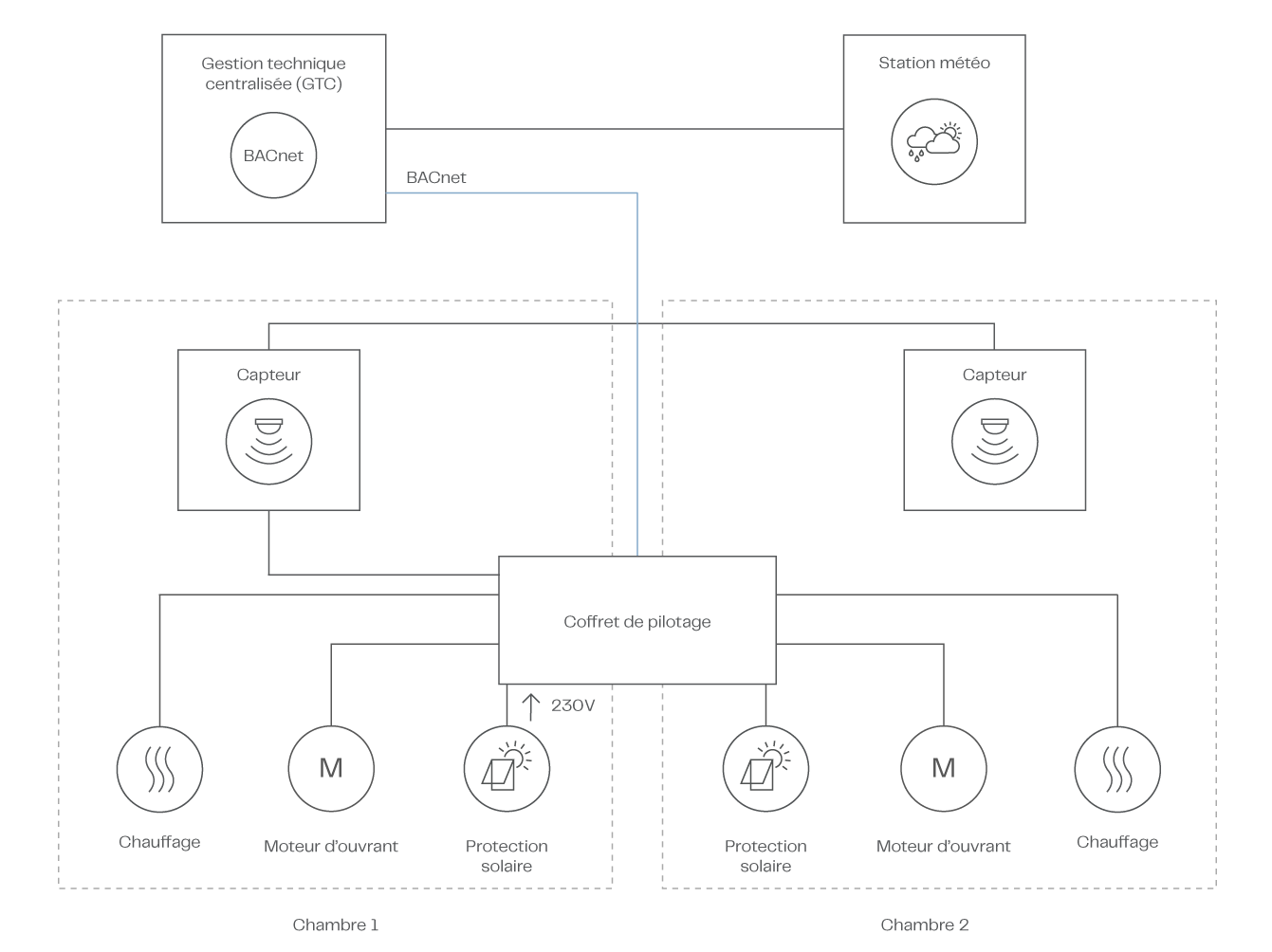 Aucune technologie de bus de terrain spécifique n’est requise car le système est compatible, en fonction du niveau d’intégration, avec BACnet, Modbus ou KNX.