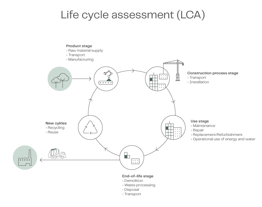 The EPD is based on a so-called life cycle assessment (LCA). A product’s lifecycle spans all processes from raw material extraction through manufacturing and processing to installation, usage, and disposal/recycling.